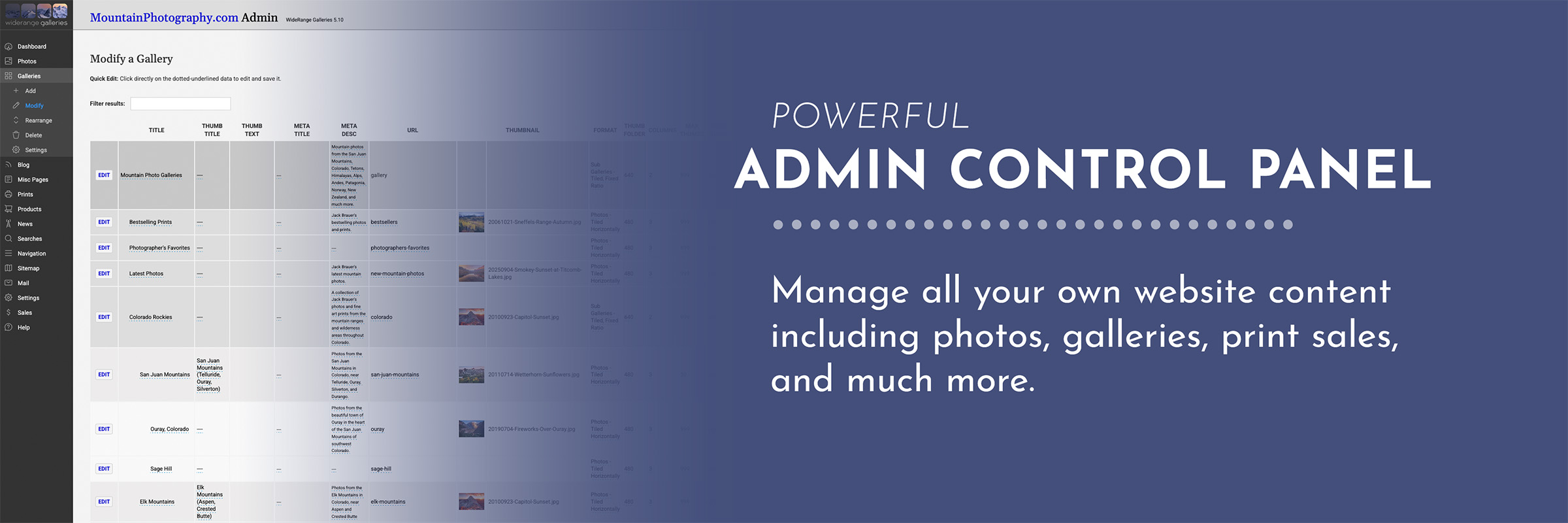Thank you for all the work you’ve done in creating my website. I’m very happy with my WideRange Galleries design. The admin interface is easy to navigate and uploading content is a breeze. I like how there are lots of customization options, and I can determine my print sizes, display options, prices, and shipping charges. The website also allows you to display different purchasing options and is linked to Stripe payment processing. I appreciate you coming out with new versions or upgrades to the admin interface as well.